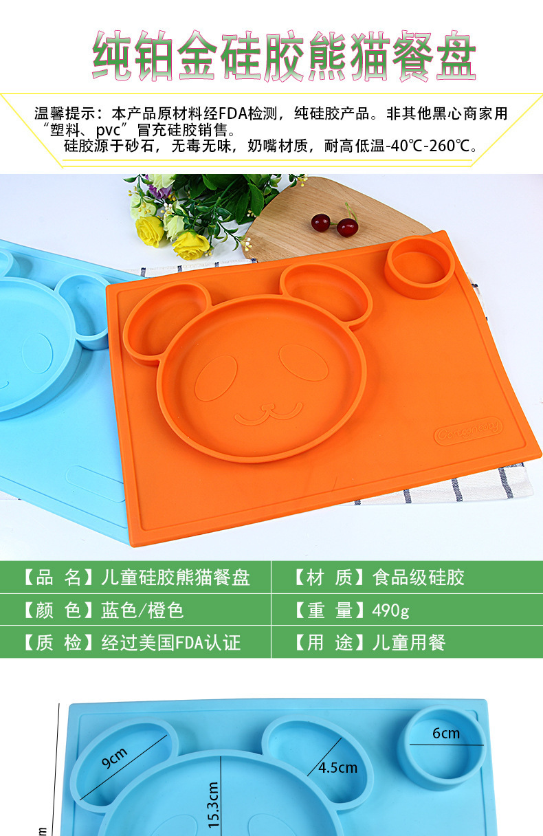 特點:二合一設(shè)計,防水、實用、方便,餐盤+餐墊一體式設(shè)計,餐墊可直接吸附在桌面上,熊貓造型,增加孩子的食欲,容量設(shè)計合理,防止兒童小手打翻。